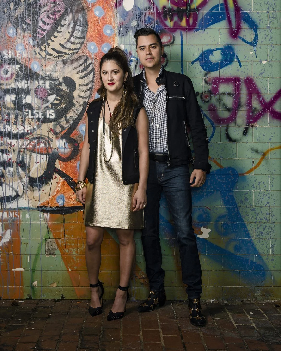 CC Witt wears a Jordan Lewis vest, $373, and Bleu Bijour necklace, $180, both at Savannah Bleu; The Odells vegan leather dress, $152 at Custard Boutique; bolo tie, $22 at Gypsy World; glass earrings, $110, and mirror ring, $95, both at Zia; vintage heels, $40 at Future on Forsyth. Patrick Ellington wears a vintage jacket, $50, and bolo tie, $49, both at House of Strut; Peter Millar button-up shirt, $135 at J Parker Ltd.; leather booties, $49 at Future on Forsyth.